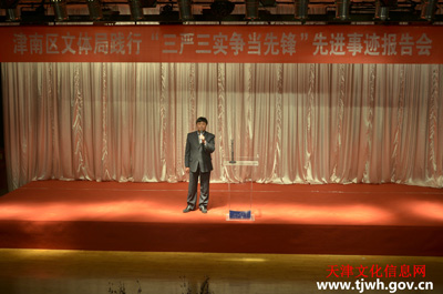为持续深入推进党的思想政治建设和作风建设, 严肃党内政治生活、 严明党的政治纪律和政治规范 , 在党员干部中开展“三严三实”专题教育, 2015年11月13日下午津南区文体局践行“三严三实 争当先锋”先进事迹报告会在津南区文化艺术中心演播厅举办。