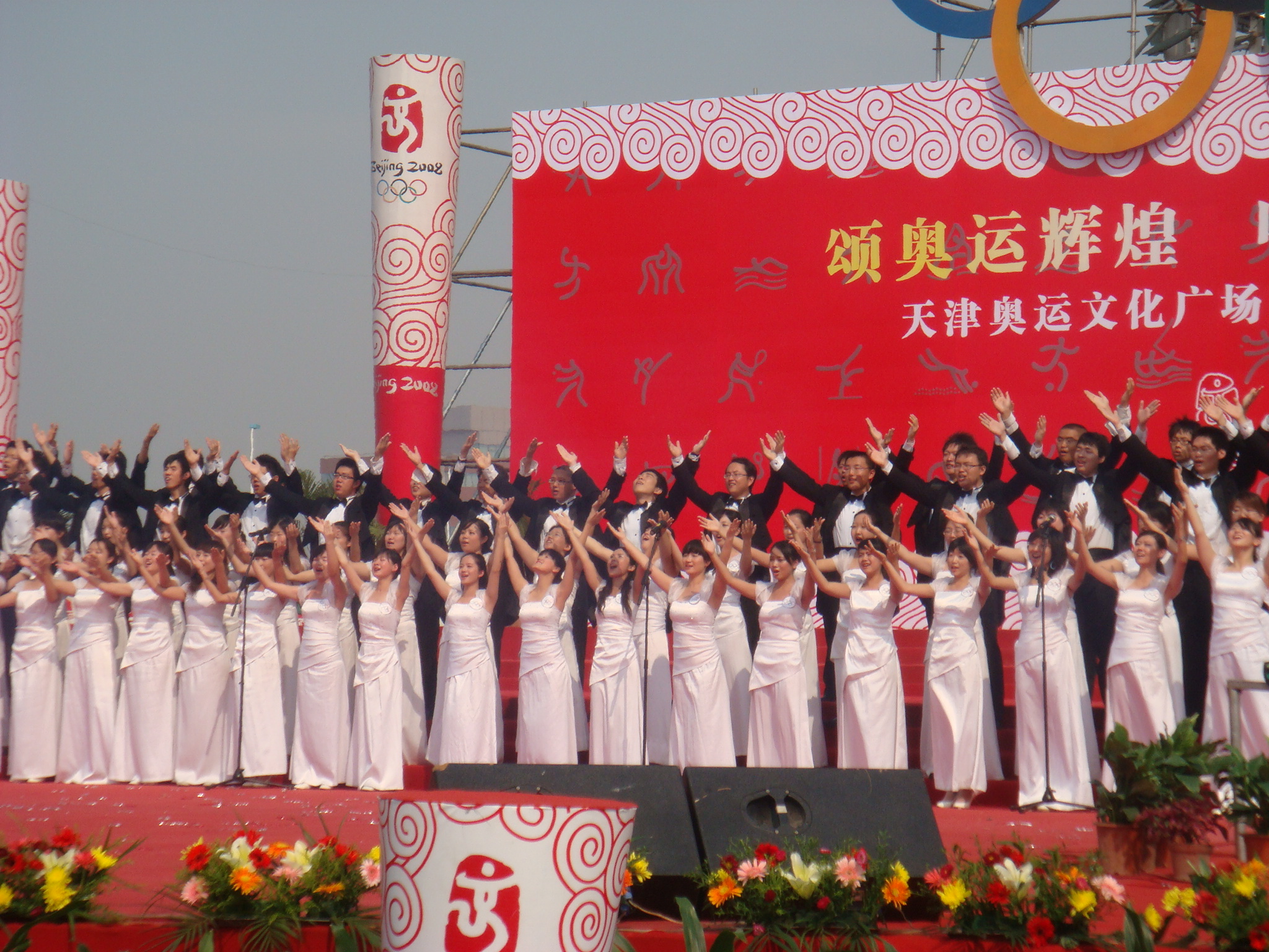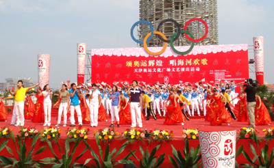 在奥运比赛的最高舞台上,作为东道主的中国赢得51枚金牌,为奥林匹克运动史留下辉煌的一页。8月24日上午,精心打造的天津奥运文化广场庆祝演出也精彩呈演。 演出以“颂奥运辉煌、唱海河欢歌”为主题,分“欢庆成功”、“深情回望”和“相约明天”三个板块,以欢快、喜庆、回味、共享为主调,以奥运歌曲为主线,精彩的演出让现场观众目不暇接、掌声不断。美丽的烟花、飘扬的各国国旗、孩子们可爱的笑脸和人们的喝彩声,以及专门创造的歌曲《火红的八月》和《相约明天、与爱同行》,都表达了天津人民“敞开心胸,尽情分享奥运成功”、“与爱同行,共铸奥运的光荣”和“相约明天,实现民族伟大复兴”的深情和美好祝愿。北京奥运会87公斤级以上柔道冠军佟文和教练吴卫凤的出场更是点燃了全场观众的热情,雷鸣般的掌声、欢呼声顿时响彻广场,把天津奥运文化广场活动带入高潮。